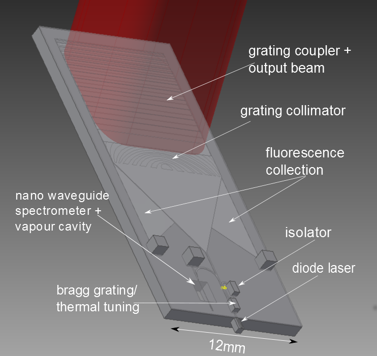 | Laser cooling and manipulation of atoms requires highly stable and spectrally pure lasers. Typically for a Rubidium MOT one requires tens of mW of laser power at 780nm, which is stabilized to within a MHz (1 part in 109). Not only that, but the lasers may need to be phase modulated at several GHz, detuned for further cooling and optical pumping, as well as being switched on and off in microsecond timescales. The manipulation lasers (e.g. Raman, or optical dipole trap, lasers) require even more power and more stringent control over frequency, phase and amplitude. Commercial cold atoms devices will need to do all of this in far more compact form with greater reliability and plug'n'play interfaces. The laser chips themselves are very small (mm) and a majority of the control optoelectronics and spectrometers can be significantly reduced in size using optical waveguides and fibres. The development in miniaturization and reliability of similar laser systems has already be carried out by the Telecoms industry to make the internet possible, so we aim to adapt their systems and techniques to the shorter wavelengths used in laser cooling. |